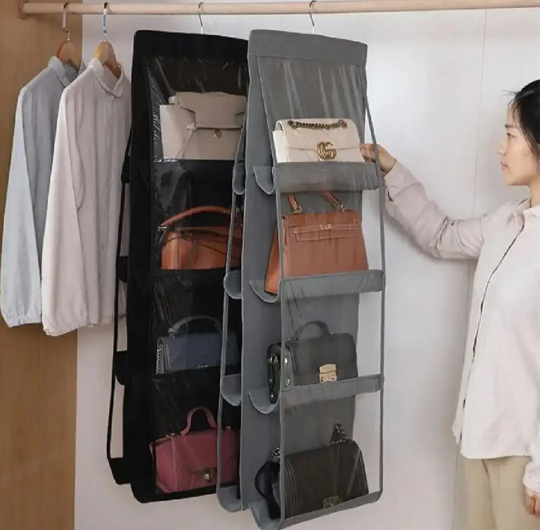 Size: 90*35cm 6 big individual pockets, enough capacity to hold your purses or totes Rotatable hanging hook and transparent windows for easier use Keep your closet or wardrobe clean and tidy