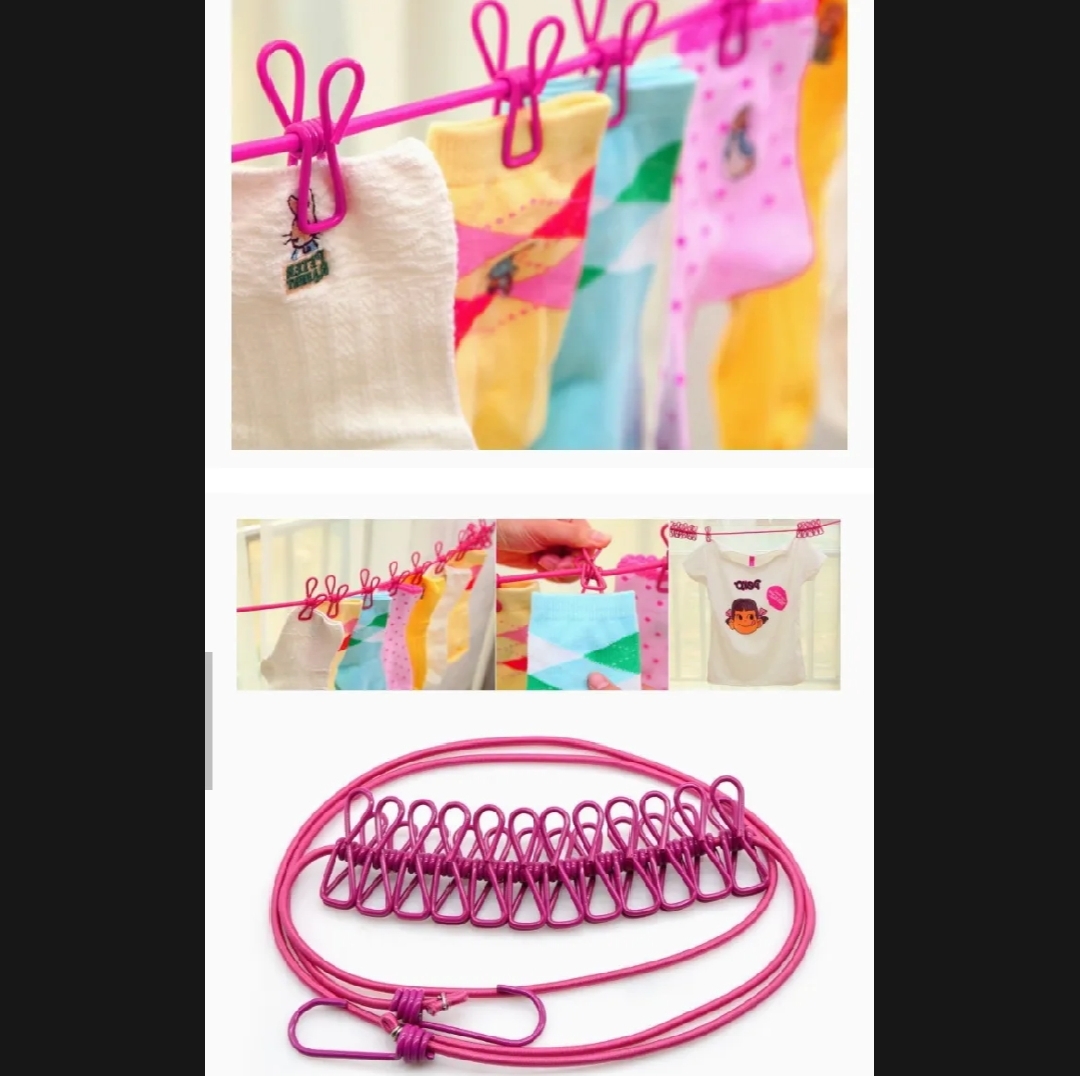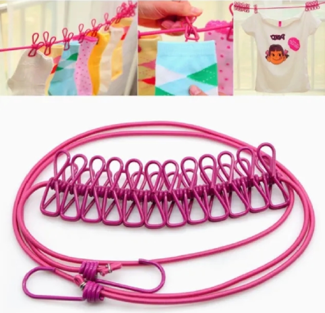 Elastic Rubber Band with good tenacity and durability, it can be stretched up to 10 feet and Strong & Long enough to hold many clothesEasily fixed by two strong hooks, which are made of metal and very strong, 2 hooks are made of metal , very strong and it can be attached anywhere: hotel, bathroom, backyard ,laundry, RV, boat, balcony or even attached on trees. You can have an instant drying space anywhere whenever they need.Portable Clothesline perfect for travel camping laundry hotel boat balcony backyard outdoor and indoor drying clothes use.User-Friendly Design-- The 12 Clips are separated by 13 Black Rubber Beads.Therefore, no need to worry that clothes bunching up together due to weight or wind and improves drying effect. travel clothesline convenient to carry with a Storage bag.