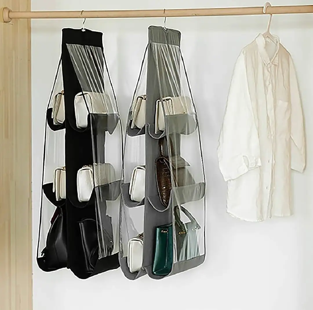 Size: 90*35cm 6 big individual pockets, enough capacity to hold your purses or totes Rotatable hanging hook and transparent windows for easier use Keep your closet or wardrobe clean and tidy