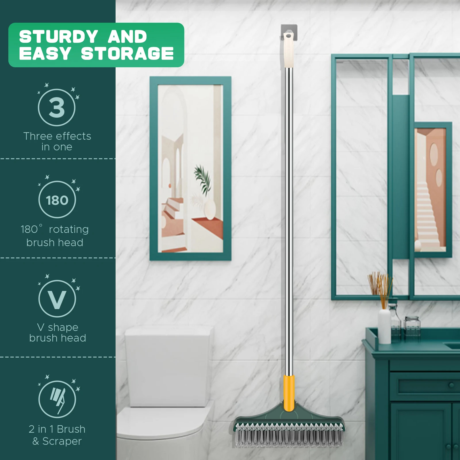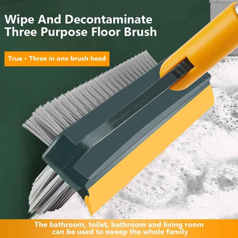 1.3-in-1 floor brush: This scrubber with handle features the latest three-sided design, two brushes with dense bristles, ideal for cleaning floors and walls, and a durable rubber squeegee for removing dirty water and dust to improve the efficiency of your housework
