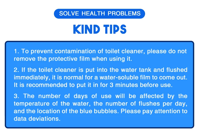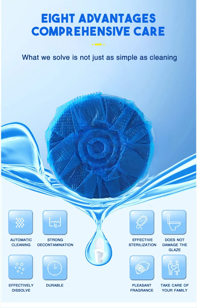 • Using our Toilet Bowl Cleaner is effortless. Simply drop one tablet into the toilet tank, wait for at least 30 minutes until the water turns blue, and flush. Our toilet cleaner tablets are designed for easy operation, making cleaning your toilet a breeze.
